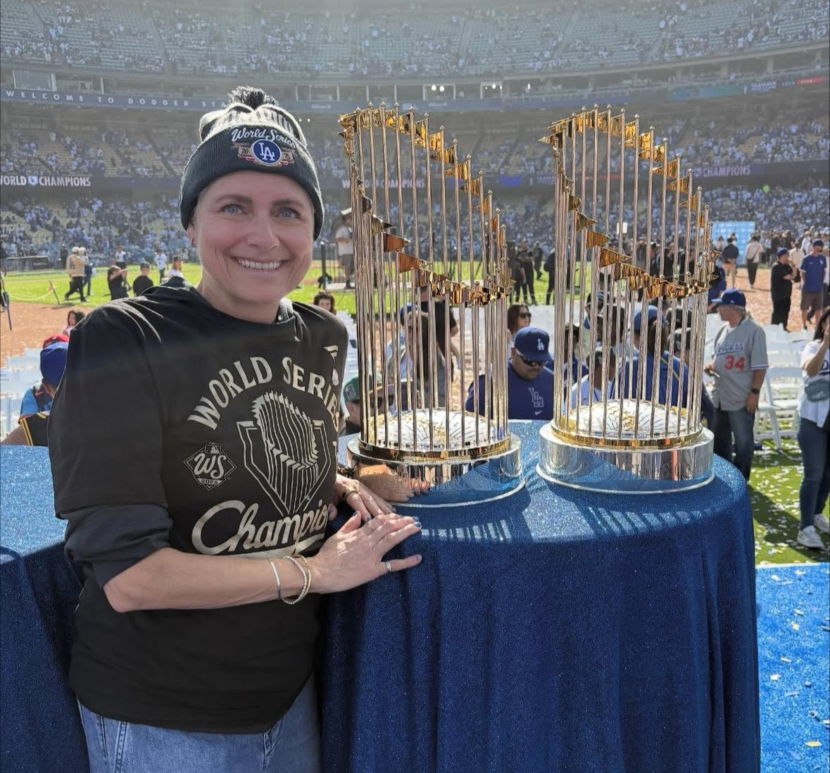 Woman, smiling and wearing a winter hat standing next to two trophies on a baseball field