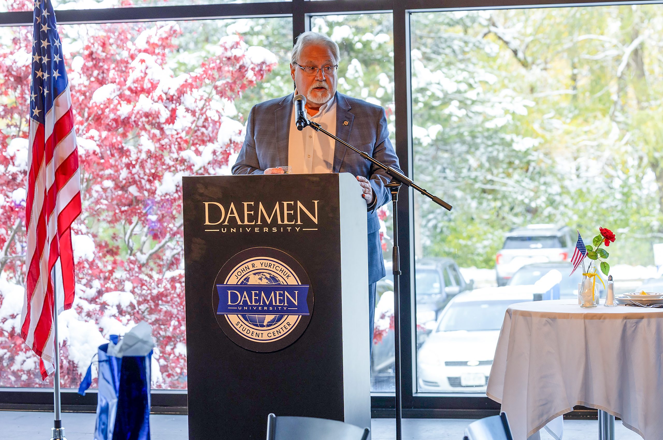 Swan narrated the fallen comrade table ceremony, a tribute to service members who are prisoners of war, missing in action, or have died in the line of duty, while additional members of the Daemen Student Veterans of America Chapter set the small round table for one with symbolic items.