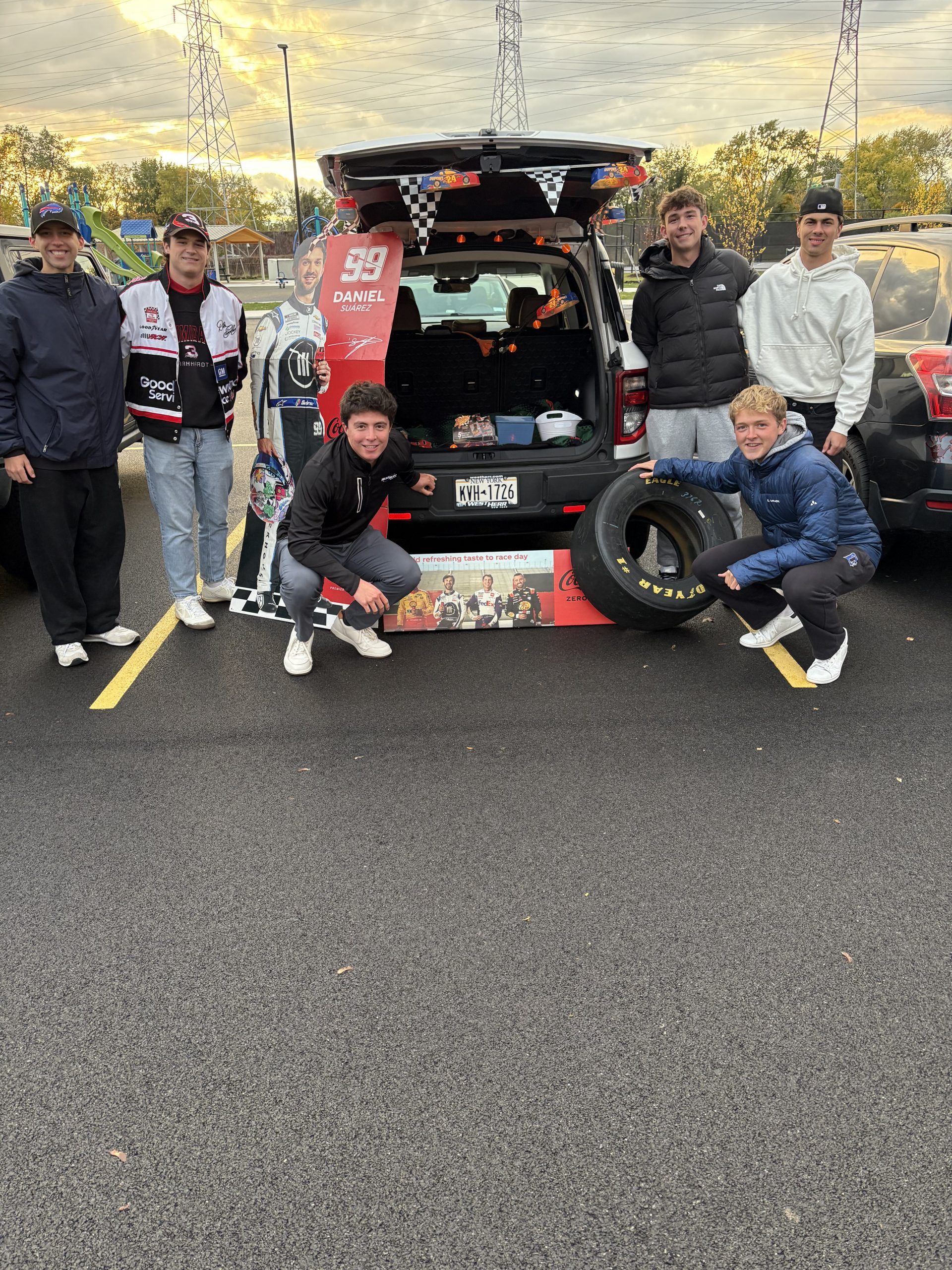 They decorated 15 cars in various themes, including Minions, Cookie Monster, Dunkin’, Buffalo Bills, Monster, Shrek, NASCAR, Toy Story, mummies and more, and handed out candy, stickers, and temporary tattoos to trick-or-treaters.Over 25 young males dressed in long pants and hoodies or jackets, standing in front of cars in a parking lot