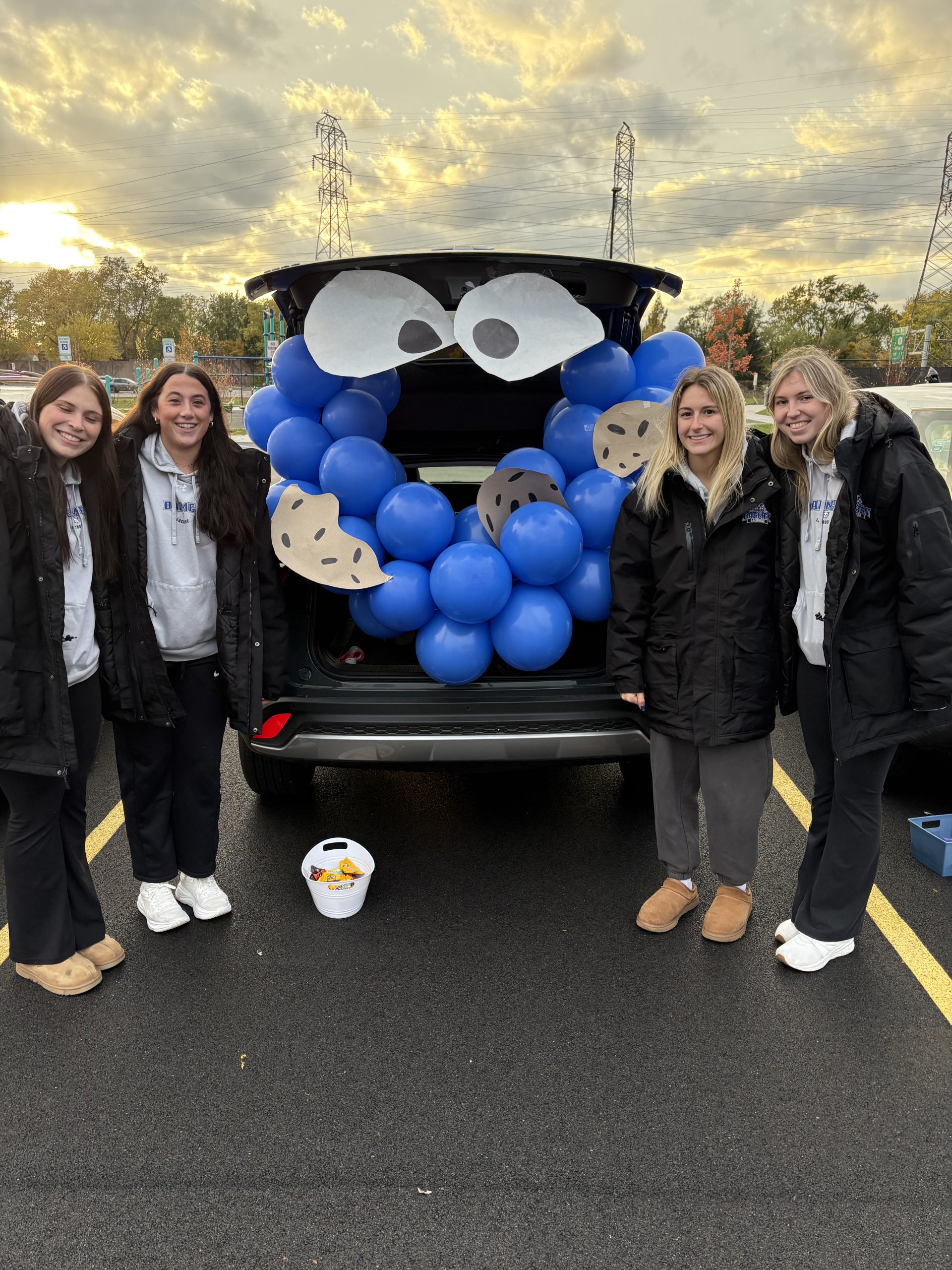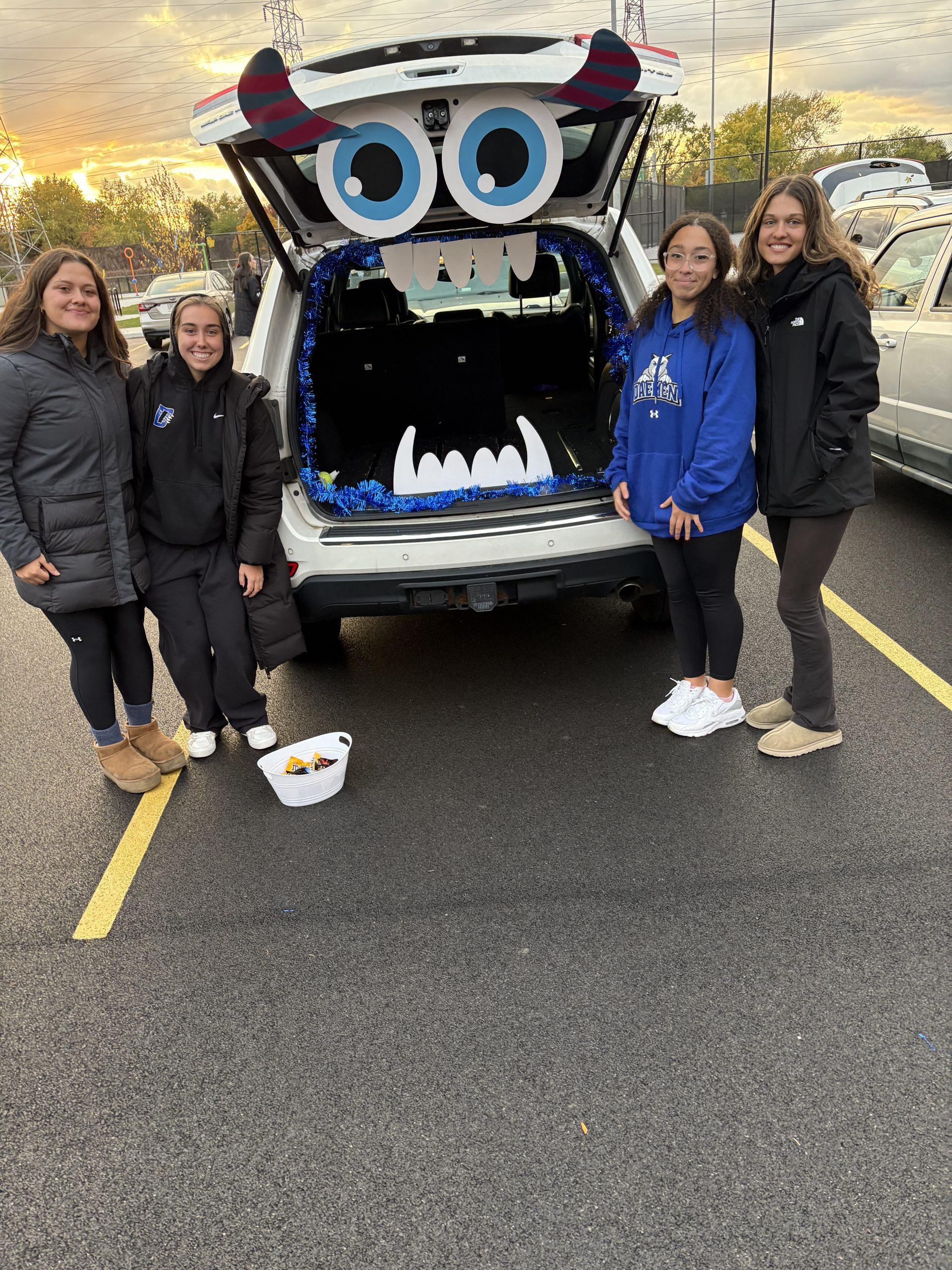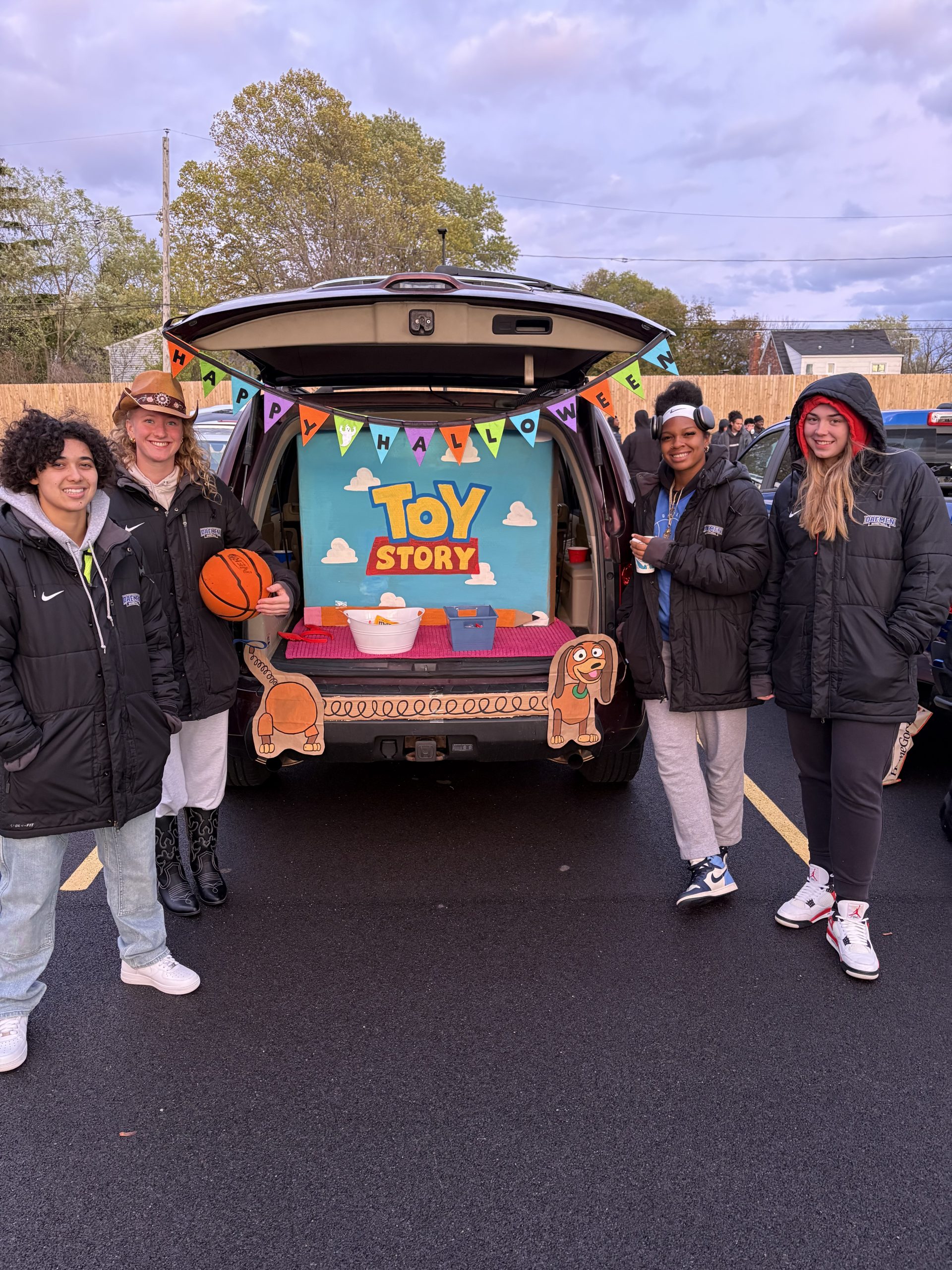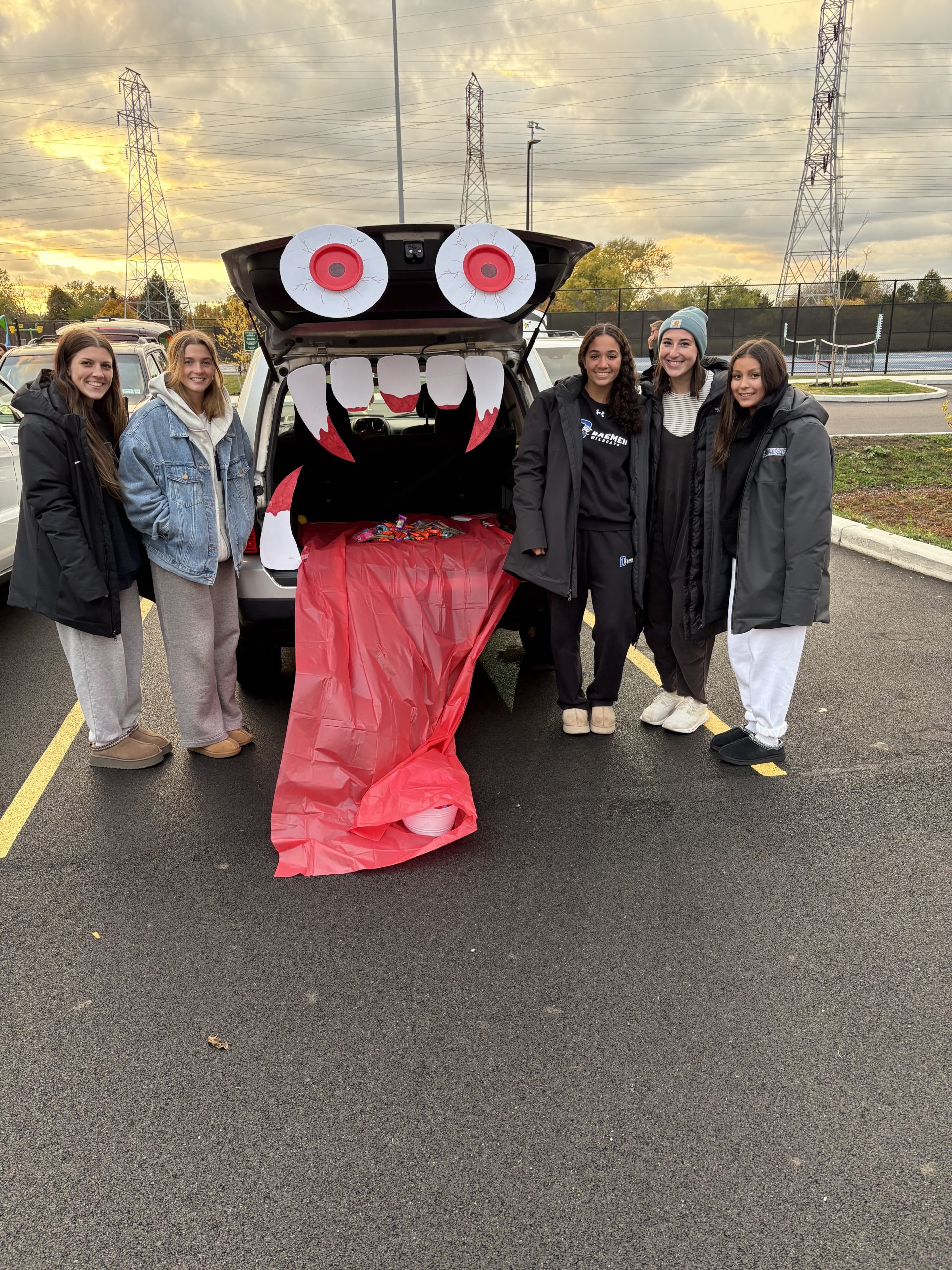 Daemen University’s Student-Athlete Advisory Committee (SAAC) hosted a trunk or treat event at Royal Park on Oct. 31 to spread Halloween cheer in the neighborhood. Thirteen young females dressed in pants and jackets, standing in front of cars in a parking lot