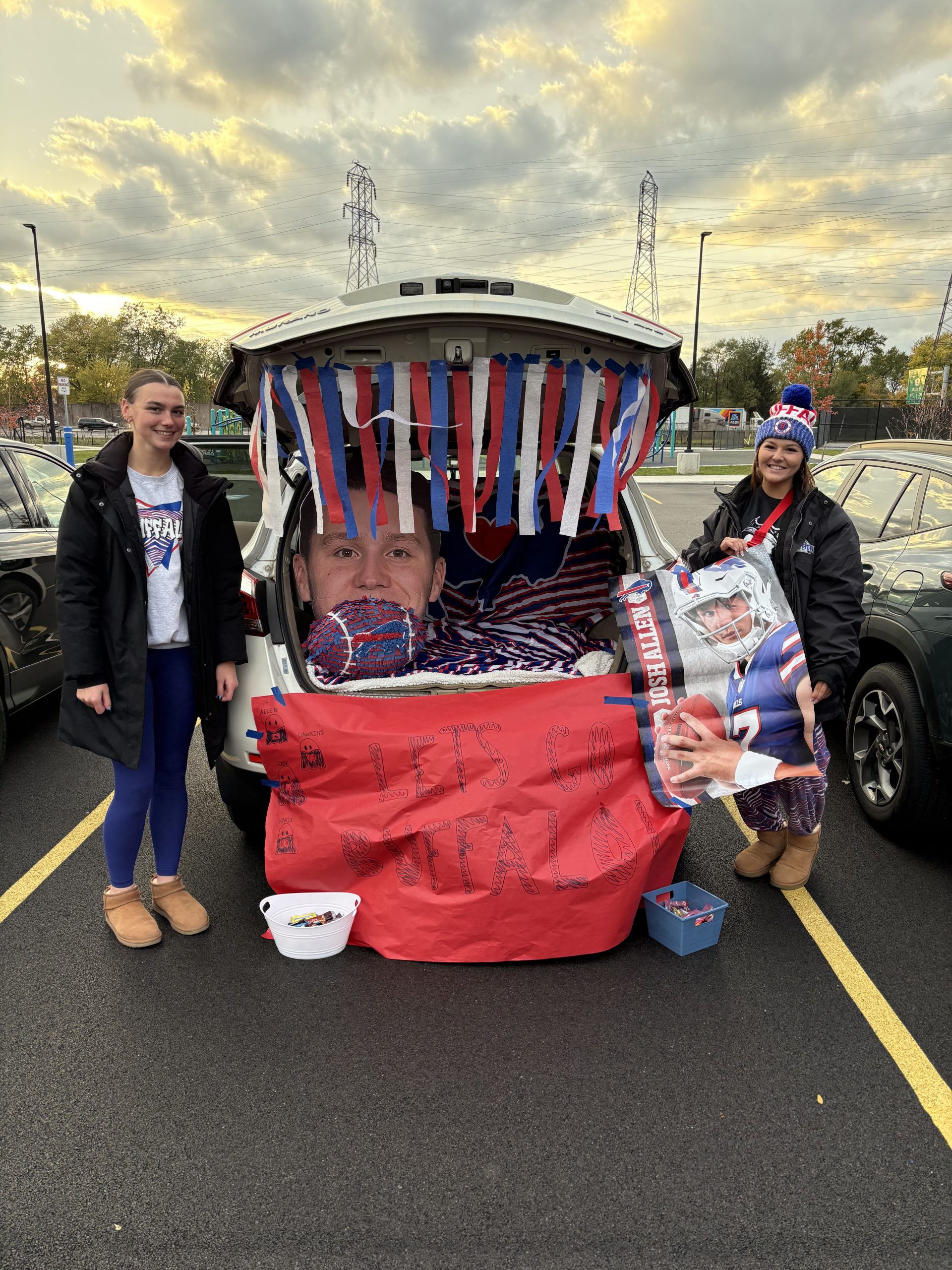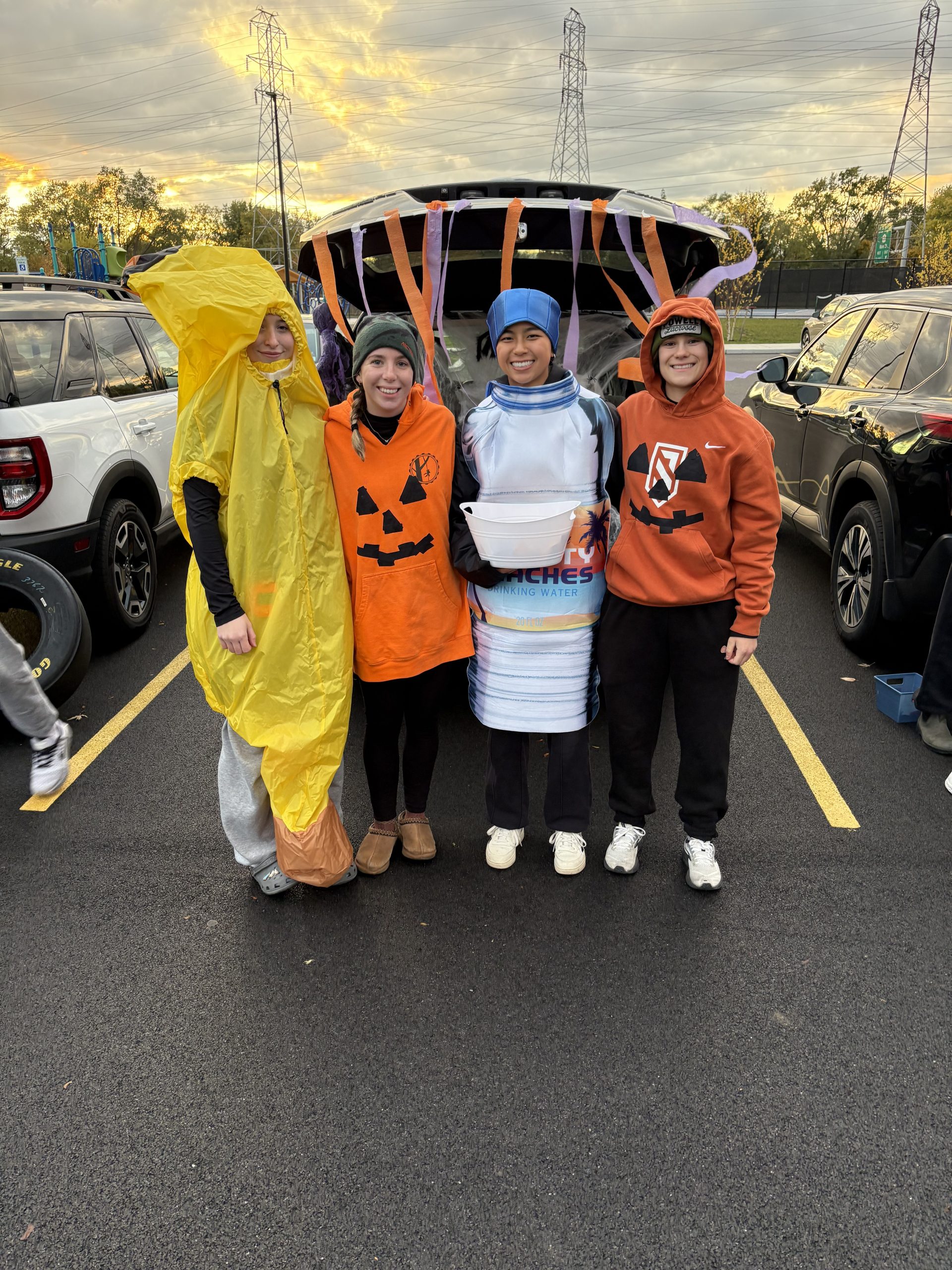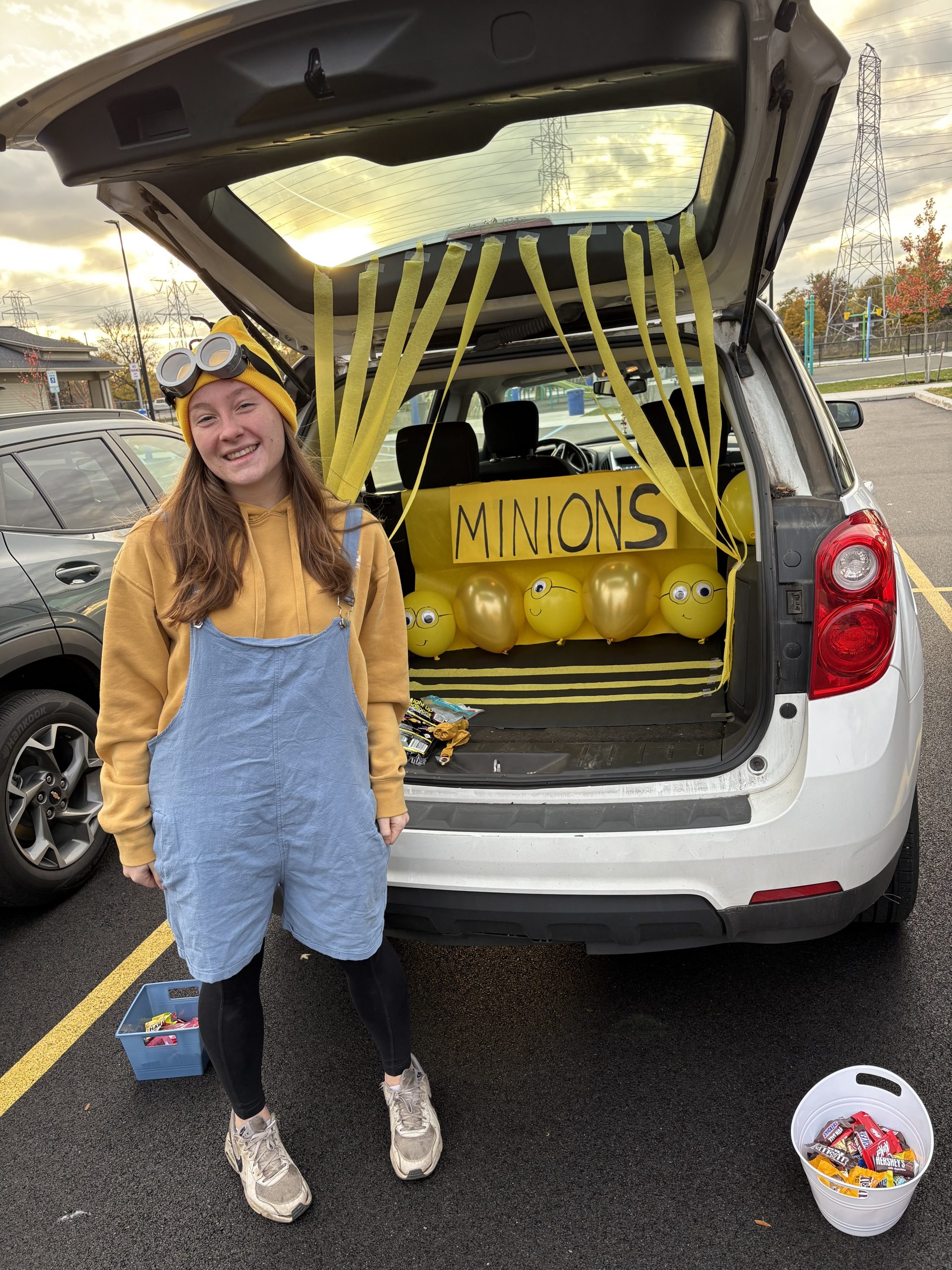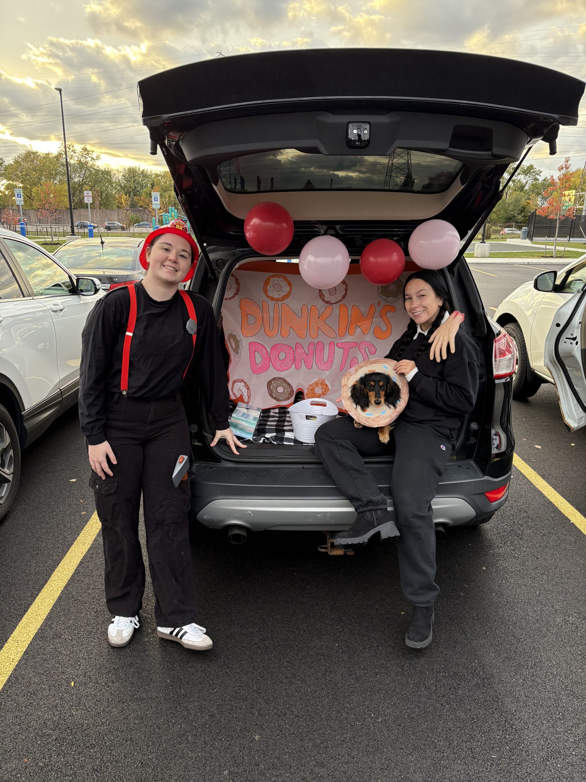 Four women wearing dark pants and jackets standing by the trunk of a car decorated as a monsterYoung female with long blonde hair dressed up as a minion standing in front of a trunk decorated with yello streamers and balloonsFour young women wearing dark pants and jackets standing in front of the trunk of a car that's decorated as Cookie MonsterTwo women standing in front of a car trunk that's decorated as Dunkin' Donuts.Two young women wearing long pants and jackets standing by a trunk of a car that's Buffalo Bills themed