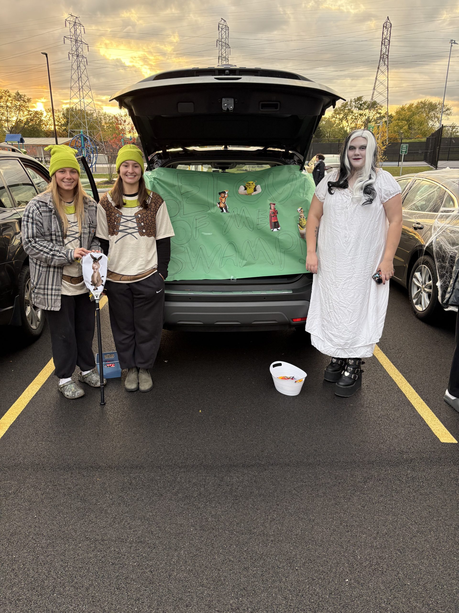 Three young women dressed as Shrek standing by a trunk decorated with Shrek motif.