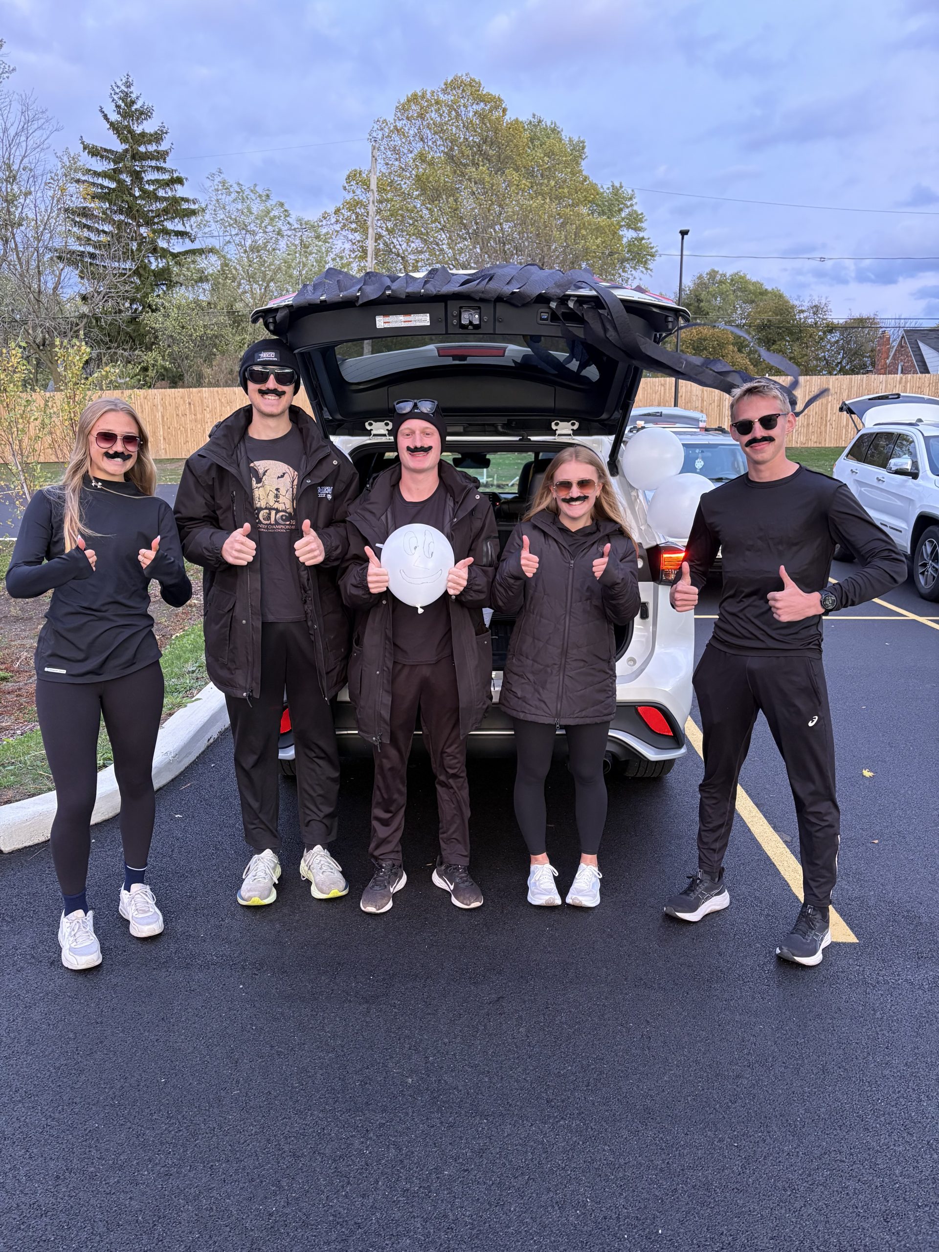Five young men and women dressed in black pants and jackets, wearing fake mustaches, standing in front of a car