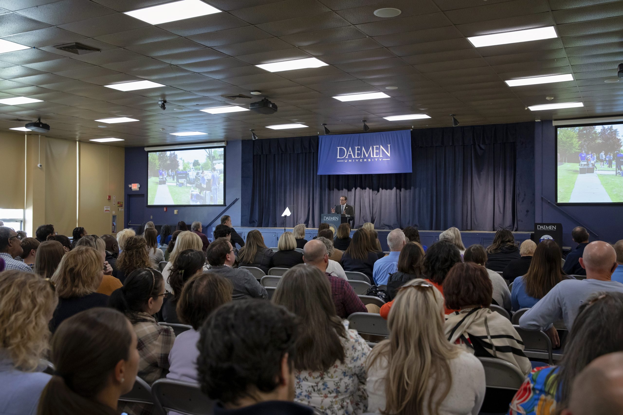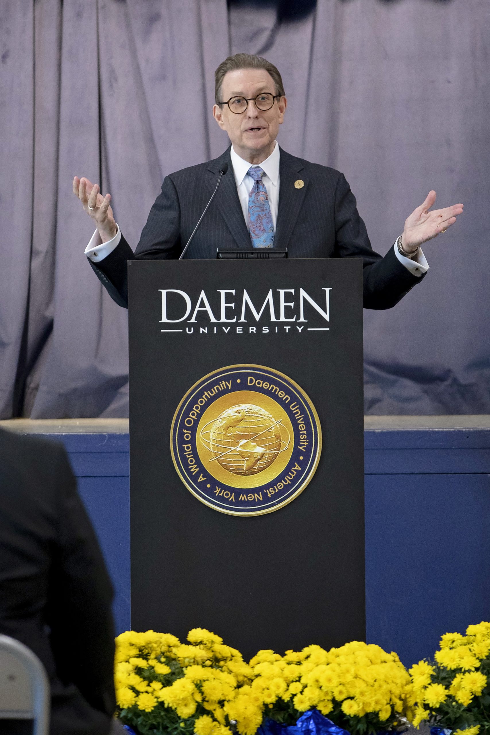 Daemen President Gary A. Olson delivered a promising State of the University address to faculty and staff on Friday, Oct. 10, highlighting the institution’s resiliency amid the evolving academic landscape. Man wearing a dark suit, white dress shirt and blue tie, standing behind a podium speaking to an audience