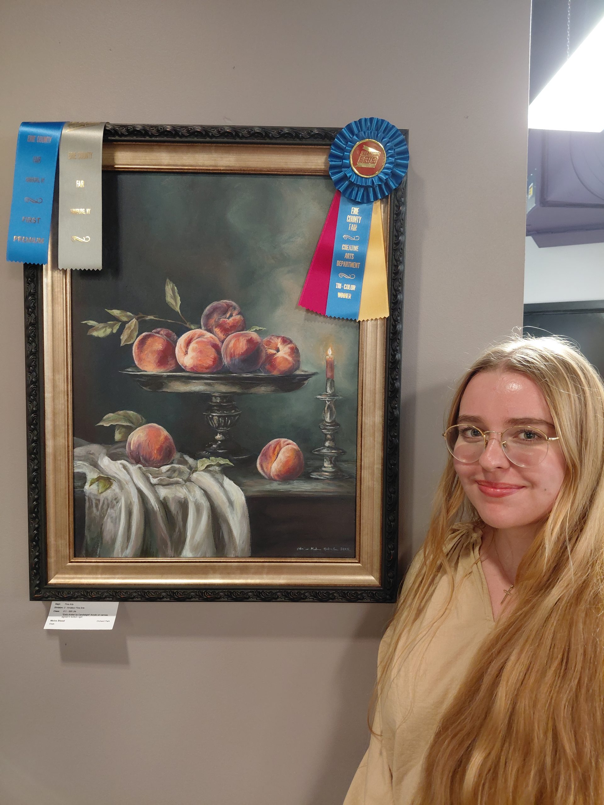 Blood’s acrylic painting, Early Amber by Candlelight, earned the Tri-Color Award (Best in Show), along with a Blue Ribbon (First Place) and a Gray Ribbon (Best in Class). This exceptional piece was completed under the mentorship of Adjunct Professor Cristiano Pereira (Painting).
