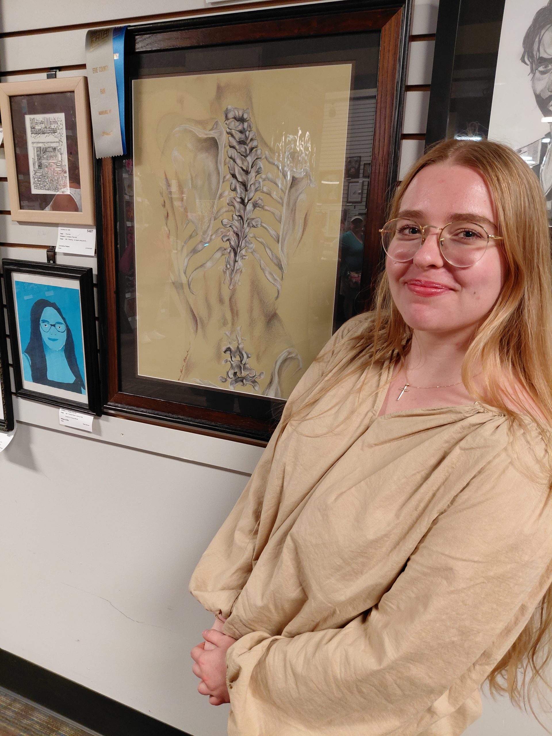 Her figure drawing, Skin Deep, guided by Professor Mike Parker, also garnered top recognition with a Blue Ribbon (First Place) and Gray Ribbon (Best in Class).