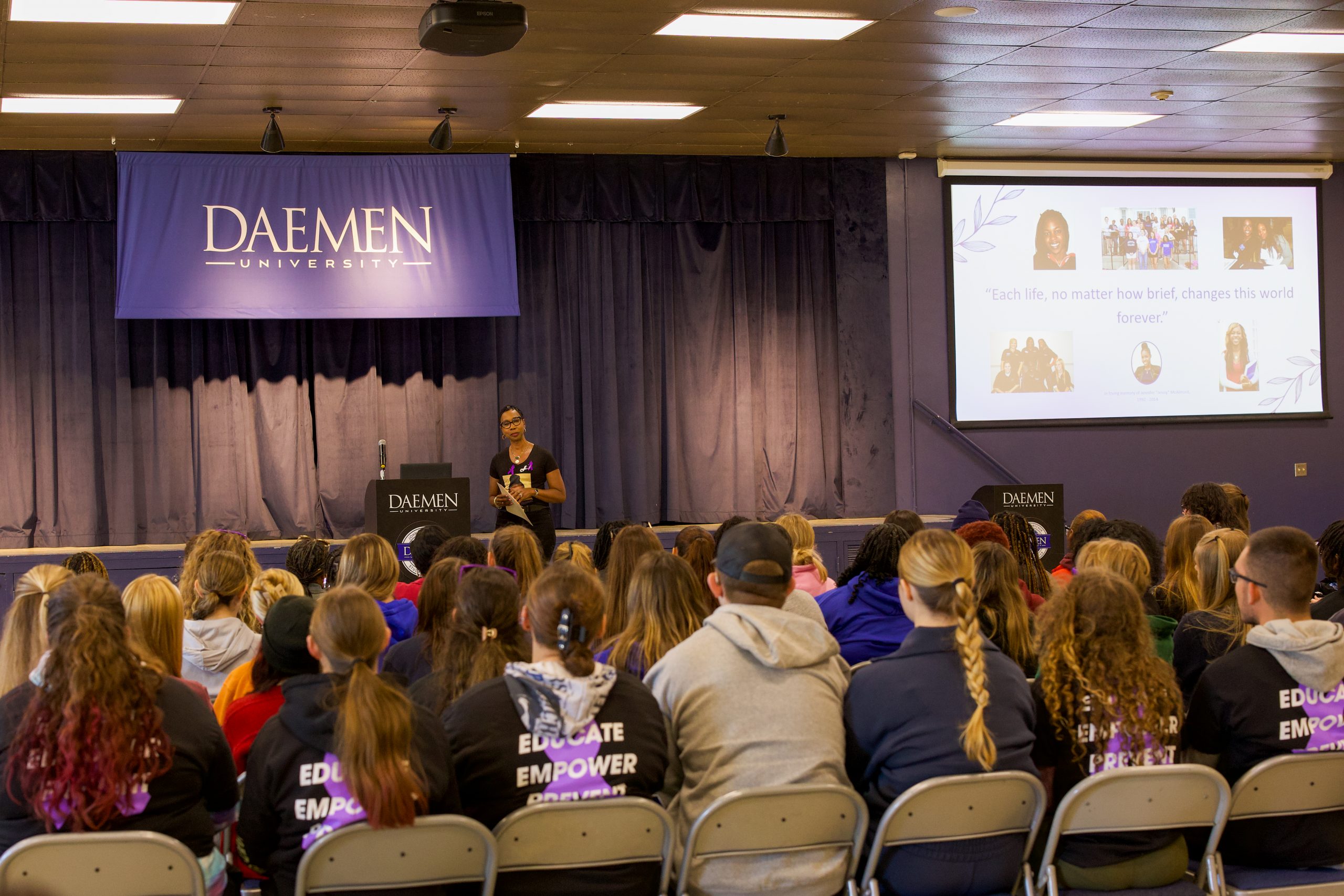 Dr. Kerry Spicer, vice president of Student Affairs, opened the tribute, sharing, “You have to say the hard things out loud, because we’ve heard them before, because other people feel them, because they’re important, and because you matter,” adding, “Remember, there is always someone to call and there’s always somewhere to go. If you call, we are going to be there.”
